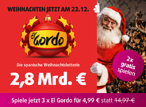 *Der Rabatt aktiviert sich automatisch. Das Angebot ist bis einschließlich 21. Dezember 2025, 23:59 Uhr gültig. Die offizielle El Gordo Ziehung findet am 22. Dezember statt. Angebot gültig für Neu- und Bestandsspieler. Ab 18. Gewinnchance Hauptpreis 1:100.000. Suchtrisiko. Hilfe unter buwei.de.